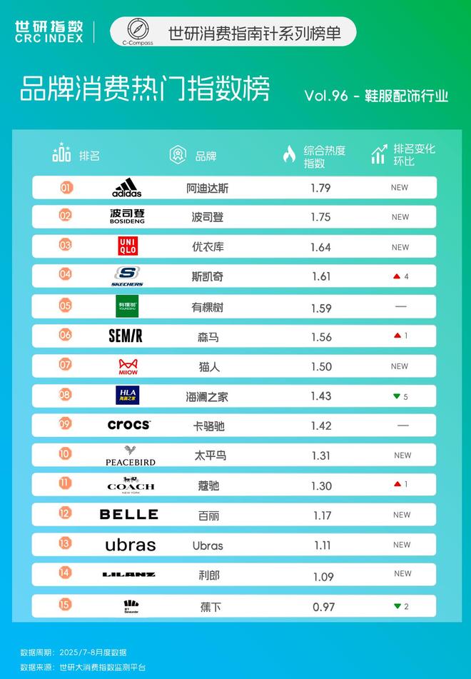 本次监测周期内,阿迪达斯、波司登和优衣库以1.79、1.75、1.64的综合热度位列榜单综合热度前三。