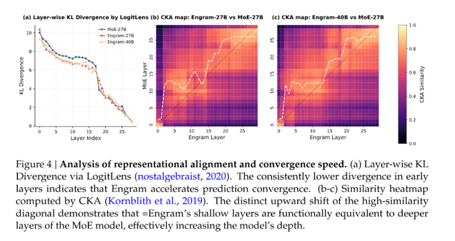 而在Engram模型中,由于第2层就插入了Engram模块,静态知识的检索在极早的阶段就完成了。