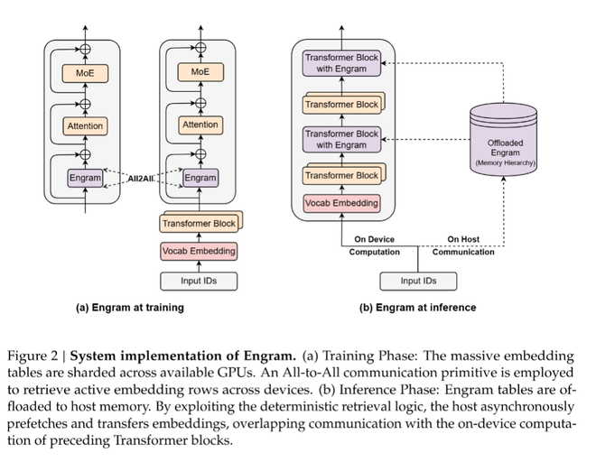 卸载(Offload):我们可以把几百亿、甚至上千亿参数的Engram词表,直接扔到便宜、量大、易扩展的“CPU内存(DRAM)”里,甚至放在NVMe SSD上。