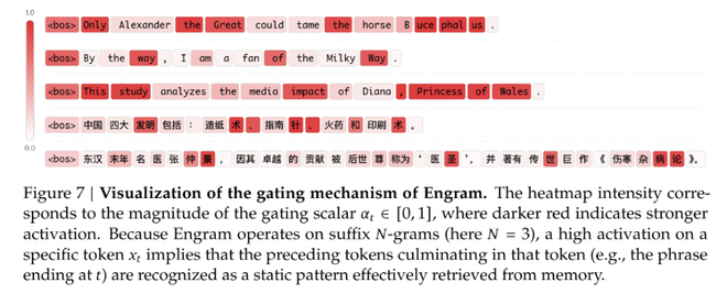 Engram模块:它是一个巨大的、可扩展的嵌入表(Embedding Table)。当模型读到“张仲景”或者“四大发明”这种固定搭配(N-gram)时,不需要动用大脑皮层去推理,直接通过哈希索引,在内存表中“查”出对应的向量。