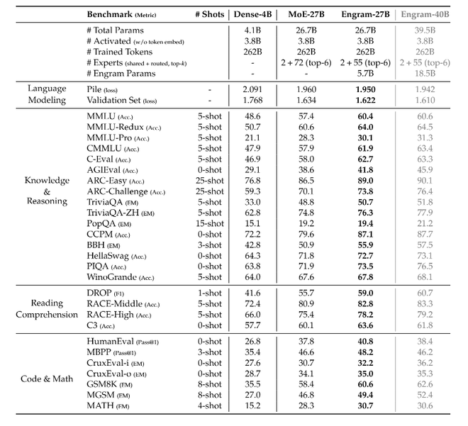Engram-27B:混合模型(55个专家 + 5.7B Engram参数)。