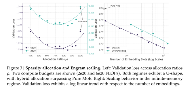 左侧极端(纯Engram):如果把参数全给字典,Loss很高。因为模型变成了“书呆子”,光有死记硬背,没有逻辑推理能力。