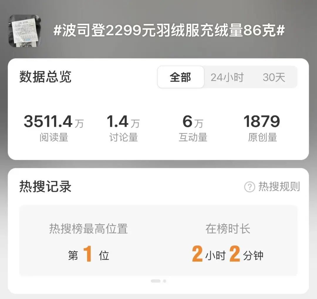 紧接着,#2299元波司登羽绒服充绒量仅86克# 的话题就上了新闻,甚至登上热搜第一。