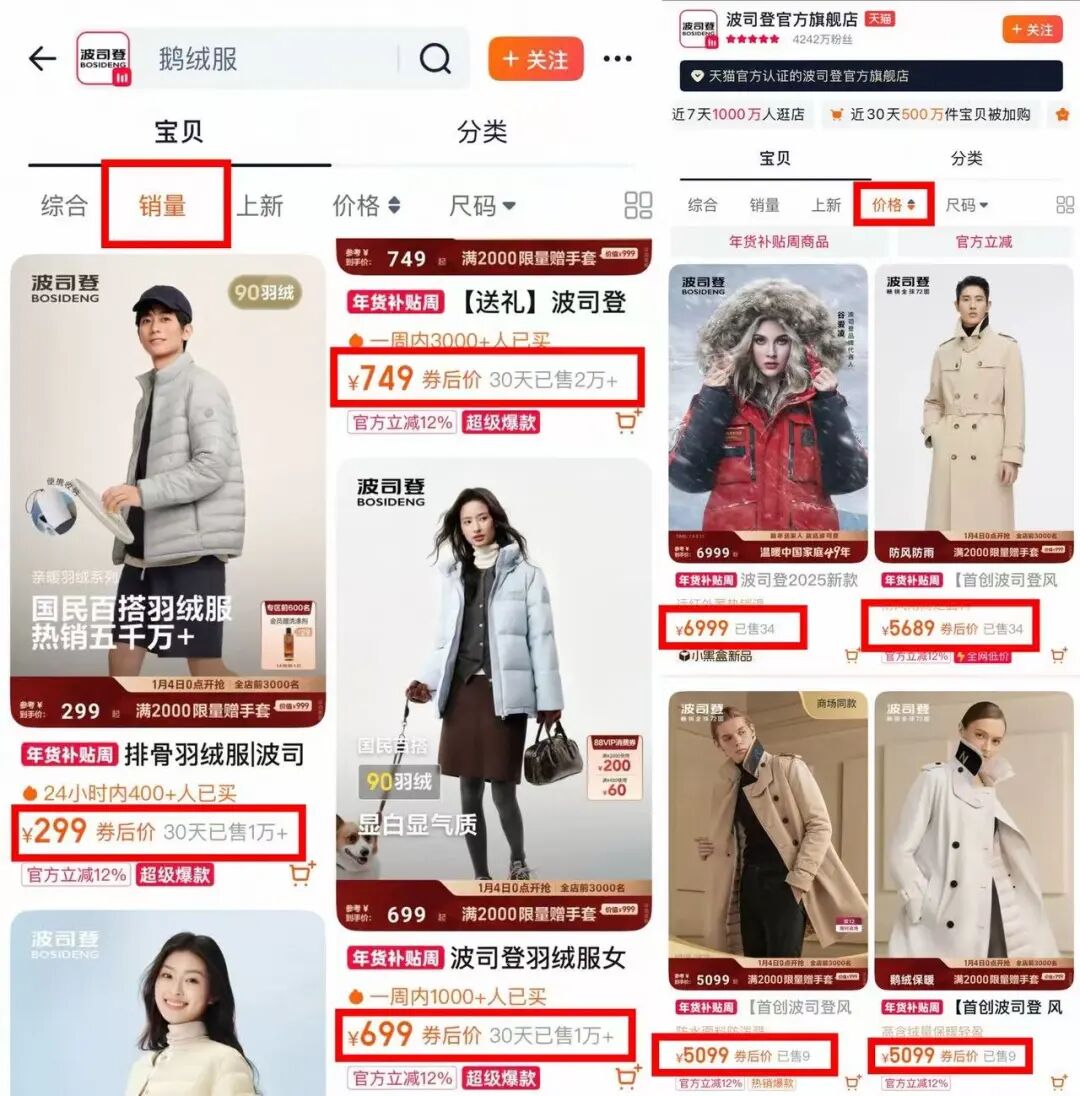 截至目前,在天猫的波司登官方旗舰店,销量最高的前三款羽绒服价格分别为749元、299元、699元,30天销量均在万件以上。而价格最高的极寒系列羽绒服和商务系列羽绒服,定价均在5000元以上,销量分别仅有34件和9件。