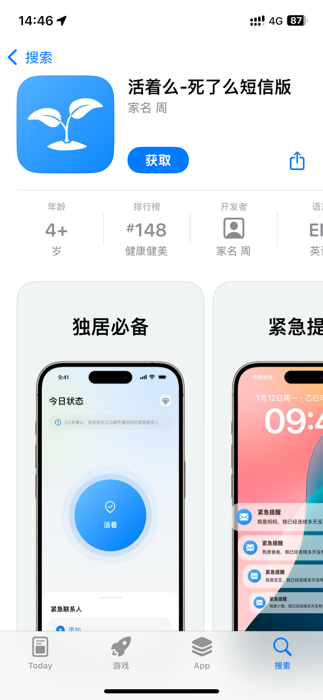 记者查询发现,目前苹果应用商店中已出现至少两款功能几乎相同的免费应用:一款与“死了么”同名,另一款名为“活着么(死了么短信版)”,均显示为个人开发。上述两款应用同样采用极简设计,核心逻辑一致,仅在通知方式和收费策略上存在差异。