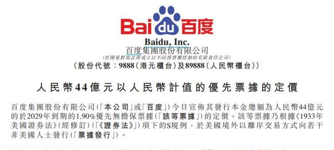 9月8日,百度宣布计划于美国境外以离岸交易方式,发行以人民币计值的优先无担保票据;票据发行所得款项净额将用作一般公司用途,包括偿还若干现有债务、支付利息及一般公司用途。