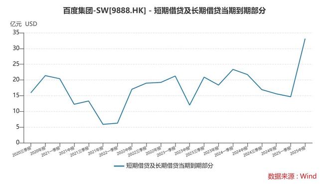 但从百度的短期借款到期金额看,2025年中报显著上行。从一季报的14.66亿美元上升至33亿美元,为2017年至今近二十年的新高,以此来看,百度有动力优化其债务结构。