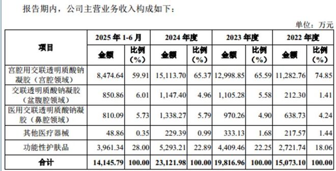其中宫腔用交联透明质酸钠凝胶(宫腔领域)产生的销售收入分别为11282.76万元、12998.85万元、15113.7万元、8474.64万元,分别占当期主营业务收入的74.85%、65.59%、65.37%、59.91%,占比始终在6成以上徘徊,产品结构单一化特征显著。