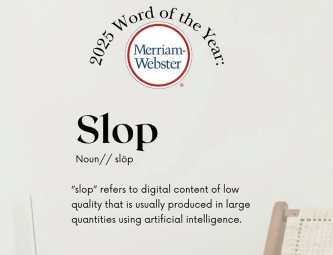 就在前几天,“Slop”被《韦氏词典》列入2025年度热词,被定义为“通常由人工智能(AI)批量生成的低质量数字内容”。据专家溯源,“Slop”在18世纪时意为“软泥”,19世纪时指代“食物残渣”,后引申为“垃圾”“几乎没有价值的产品”,中文则译为“泔水”“脏水”。