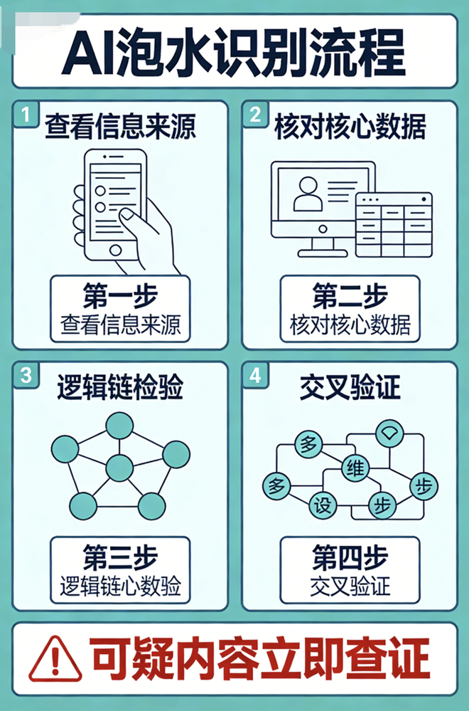 查逻辑。 AI泔水常有逻辑断层或自相矛盾。比如前一段说“研究发现A导致B”,下一段就说“B能够改善A”,却不解释为什么。