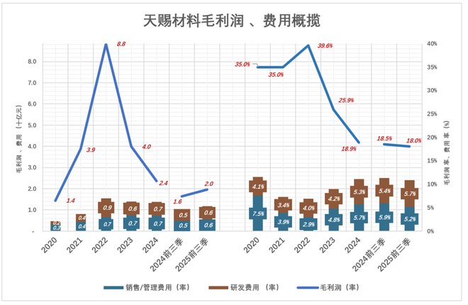 2024年,天赐毛利润仅24亿、毛利润率18.9%;总费用被压缩到13.9亿、总费用率增至11.1%;