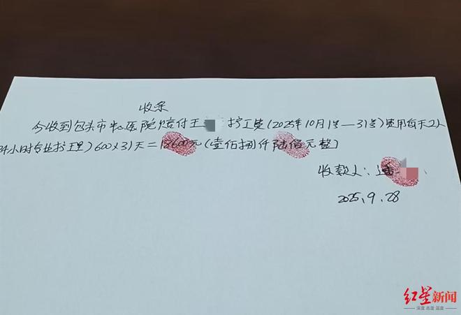 潘女士向红星新闻记者出具了2025年10月份和11月份的收条,上面写着“今收到包头市中心医院赔付王某某护工费(2025年10月1号-31号)费用每天2人(24小时专业护理)600*31=18600元(壹万捌仟陆佰元整)”,落款日期是2025年9月28日。11月份的收条显示金额是18000元。