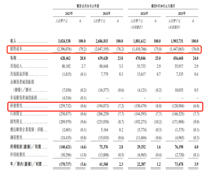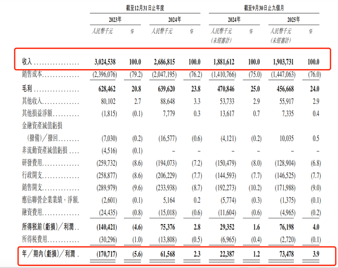 招股书显示,公司净利润率长期徘徊在6%以下,且业绩波动剧烈:2023年亏损1.71亿元,2024年虽营收回落至26.87亿元并扭亏为盈,但2025年前三季度营收同比仅微增1.2%至19亿元,经调整净利润率仅为4.5%。