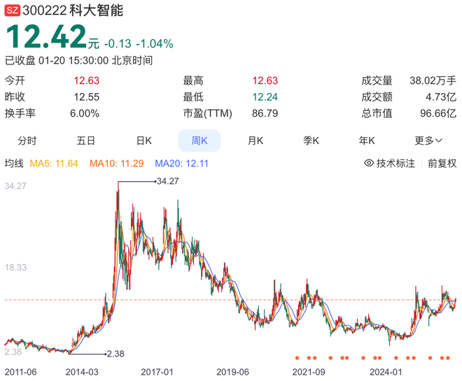 作为已在A股上市的科大智能,当前的市值表现承压。截至1月20日收盘,公司股价报12.42元,总市值96.66亿元。相较于历史最高点34.27元,公司股价已累计回撤63.76%。若此次港股上市成功,科大智能将构建起“A+H”双融资平台。
