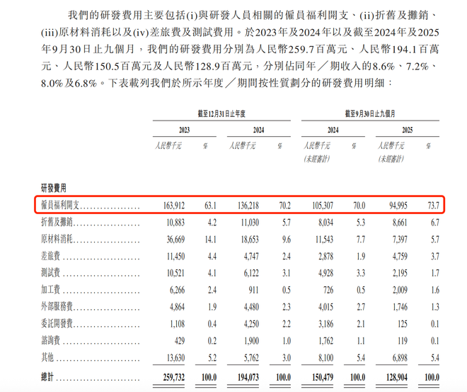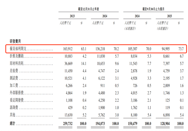 这种投入的收缩,直接反映了公司在盈利压力下的现实选择。 截至2025年9月30日,科大智能研发团队达758人,占员工总数的44.2%。这也导致研发费用结构呈现显著的“重人力”特征:雇员福利开支占比始终维持在60%以上的高位。