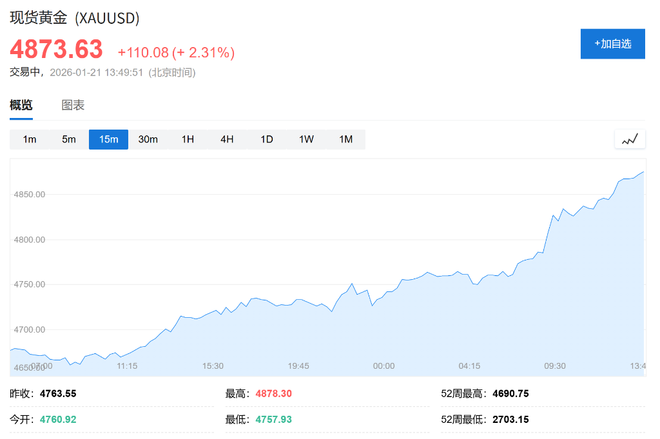 受地缘政治局势升级影响,全球金融市场避险情绪急剧升温。周三,现货黄金价格飙升逾2%,突破每盎司4870美元,创下历史新高。![]()