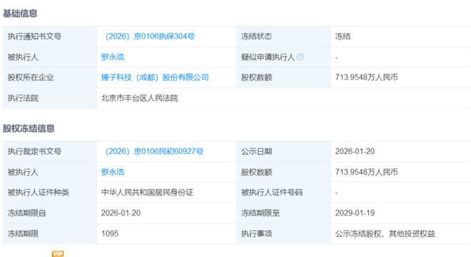 凤凰网财经讯1月22日天眼查天眼风险信息显示, 罗永浩名下新增一则股权冻结记录,其持有的锤子科技(成都)股份有限公司约714万元股权被司法冻结,冻结期限自2026年1月20日起至2029年1月19日止,执行法院为北京市丰台区人民法院。