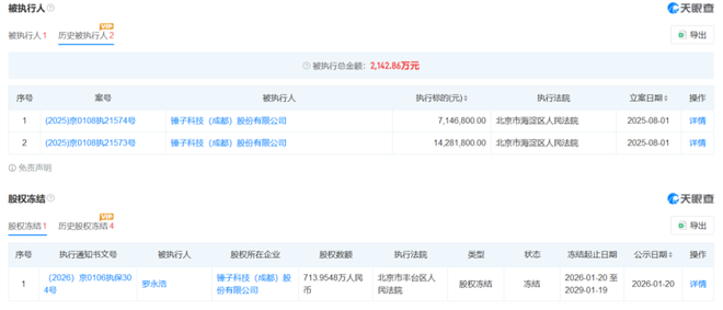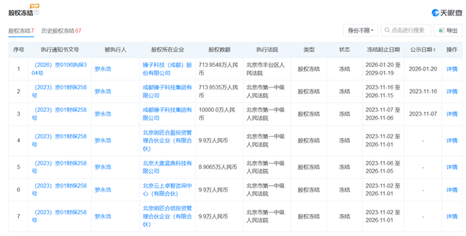 天眼查数据显示,此前罗永浩作为被执行人已存在多条股权冻结记录,均由北京市第一中级人民法院执行,冻结期限为2023年11月16日至2026年11月15日。