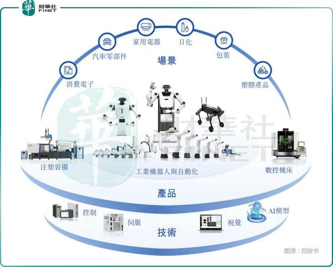 具体而言,拓斯达目前形成了注塑场景直角坐标机器人、多场景多关节机器人、全场景具身智能机器人的机器人产品序列。此外,拓斯达提供以公司的工业机器人为核心并配备视觉系统及传感器等辅助设备的综合自动化解决方案。招股书披露,工业机器人与自动化应用系统广泛应用于多个行业,包括消费电子、汽车零部件、家用电器、日化、包装、玩具制造及医疗器械。