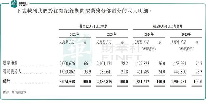 但细分业务表现却冷热不均。数字能源业务作为压舱石,2024年收入21.01亿元,占总收入比重达78.2%,2025年前三季度收入14.6亿元,保持稳健增长;而智能机器人业务则逆势收缩,2024年收入5.86亿元,同比大幅下滑42.8%,2025年前三季度收入4.44亿元,同比仍录得下滑。