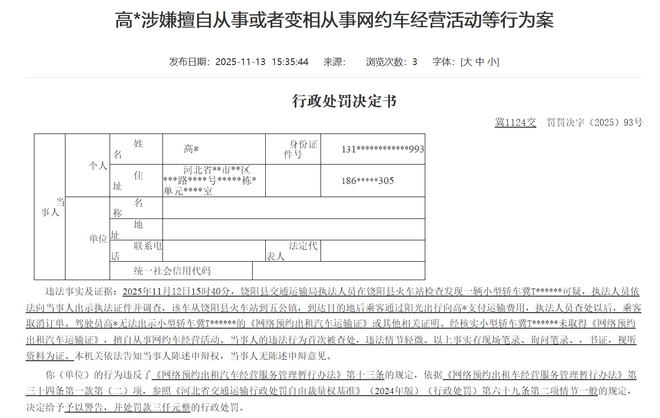 2025年11月12日,兼职网约车司机高某通过阳光出行App在河北饶阳县接单时,因未取得网约车双证(即《网络预约出租汽车驾驶员证》和《网络预约出租汽车运输证》),被饶阳县交通运输局罚款3000元。