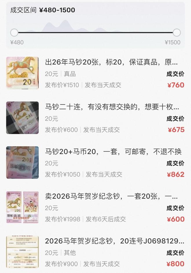 2026年1月20日兑换启动后,实物开始流入市场,二手交易也从“期货”转向“现货”,价格依据号码品相迅速分化。在成都本地收藏品交流群和二手平台上,一套20张面值400元的普通号码“马钞”,行情迅速站稳在750元以上,近七日成交均价约800元,较上周上涨逾百元。而一套20枚面值200元的“马币”,价格也普遍在240元至300元区间。
