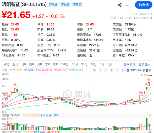 明阳智能股票今天复牌,开盘后一字涨停,截至发稿,股价报21.65元/股,最新总市值490亿元。