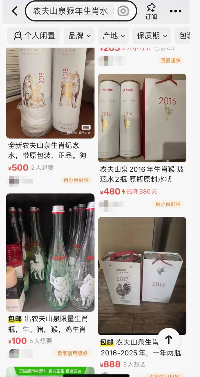 凤凰网《风暴眼》发现,在二手平台与社交电商上,农夫山泉生肖水的交易已形成一个小型市场,价格因年份与稀缺程度差异显著。