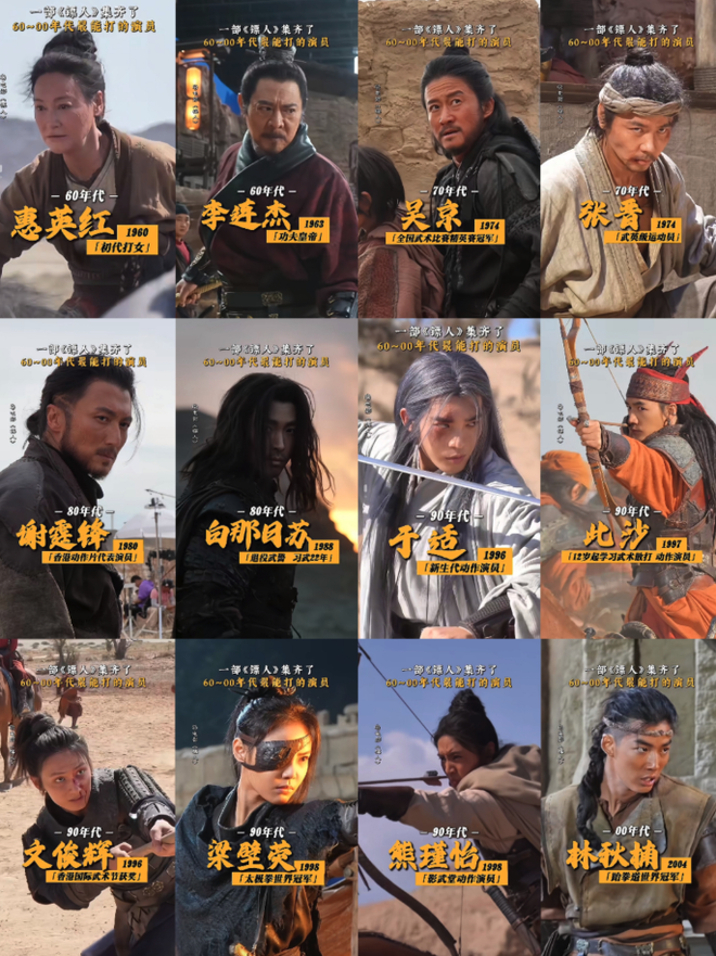 一部武侠,五代功夫影星齐聚:60后李连杰、惠英红,70后吴京、张晋,80后谢霆锋,90后于适、此沙,00后林秋楠、刘耀文等,更有越剧“破圈”巨星陈丽君、李云霄加盟,阵容如此奢华,十年难得一见。