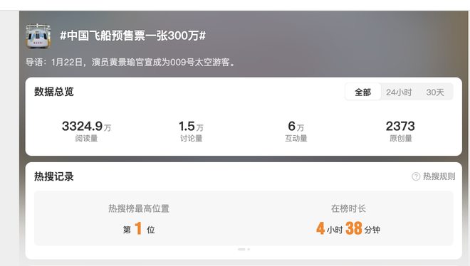 ▲23日,话题“中国飞船预售票一张300万”登上热搜
