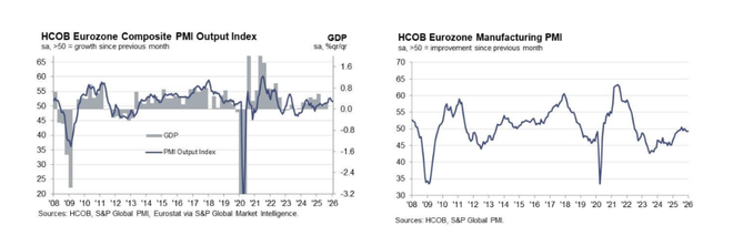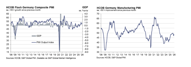 欧元区两大核心经济体在开年呈现明显分化,德国经济复苏动能进一步增强,而法国则因国内政治僵局再次陷入收缩。从数据看,德国1月综合PMI升至52.5,高于市场预期及前值,连续第二个月站稳扩张区间。制造业PMI虽仍在荣枯线以下,但收缩幅度已较上月收窄;服务业则延续复苏态势支撑整体经济表现回暖,1月服务业PMI录得53.3,好于预期和前值。