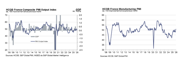 相比之下,法国经济在预算争议持续影响下再度承压,1月综合PMI回落至48.6,自去年10月以来首次跌破荣枯线。尽管其制造业PMI逆势升至51,创下近四年新高,但服务业活动急剧放缓至47.9,成为拖累经济整体表现的主要因素。