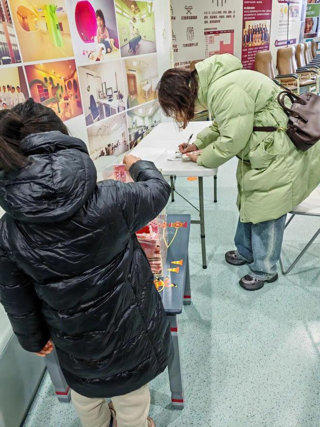 在捐款箱前,有位拄着拐杖的老奶奶,路都走不稳,捐完款后被人搀扶着缓缓离开。也有家长站在医生介绍墙前,给孩子解释什么是“序列治疗”。