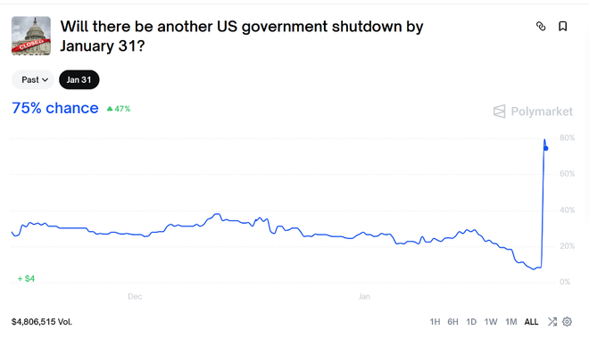 这一僵局直接冲击了原本有望在下周达成的预算协议。市场预测平台Polymarket的数据显示,受此事件影响,美国政府在1月31日前再次关门的概率已飙升至75%。多位此前曾在去年秋季投票支持政府维持运作的关键民主党参议员已改变立场,明确反对在缺乏监管改革的情况下继续为DHS提供资金。