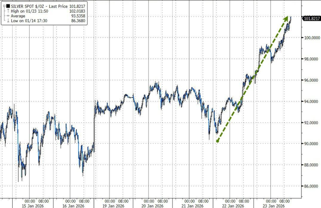 白银突破100美元,触及103美元峰值,过去9周上涨8周。