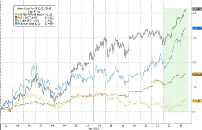最终,这一周以极度分化的局面收场:股市在动荡中小幅下跌,波动率飙升,美元遭遇重挫,而贵金属则全线爆发创下新高。尽管美国宏观数据表现出去年8月以来最好的两周连涨态势,但市场并未因此获得喘息。