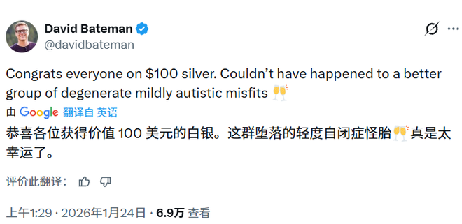 就在周五白银价格跃升至100美元上方后,Bateman在X上发文表示祝贺,"恭喜大家白银破百。这群有点自闭的堕落怪咖们真是太幸运了。"