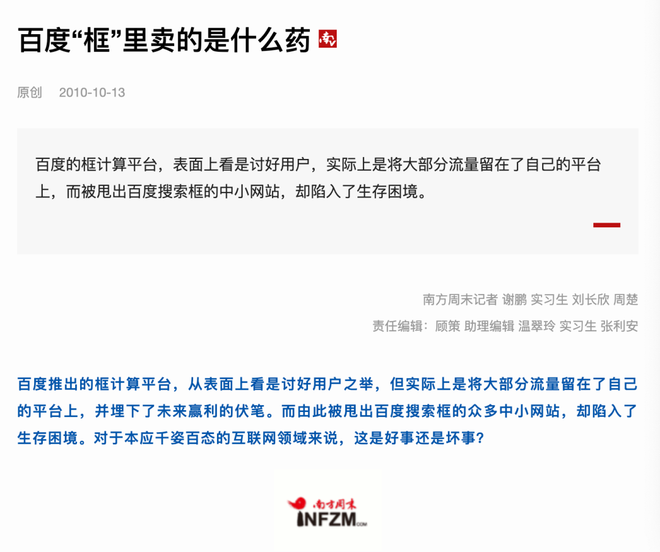 在当时框计算推出一年后,《南方周末》的报道直接指出这个生态悖论:用户虽然节省了搜索时间,但丧失了内容的客观和多样性,"百度本身的商业模式是非常依赖于互联网的百花齐放,否则最终搜索引擎变得没有用了,我们之所以需要搜索引擎,是因为互联网太庞杂了,一旦都是大网站了,我们还要搜索引擎干嘛呢?"