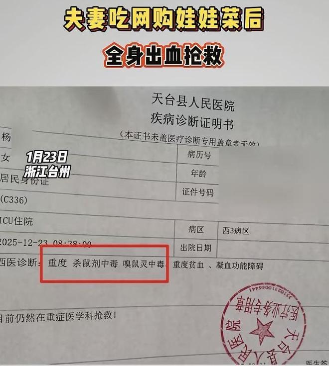 据浙江卫视科教频道小强热线节目报道,浙江天台县一对夫妻吃了网购娃娃菜后全身出血进ICU。医院诊断,是杀鼠剂中毒。商家表示,没有老鼠药。警方从娃娃菜中检测出了老鼠药,并受案。