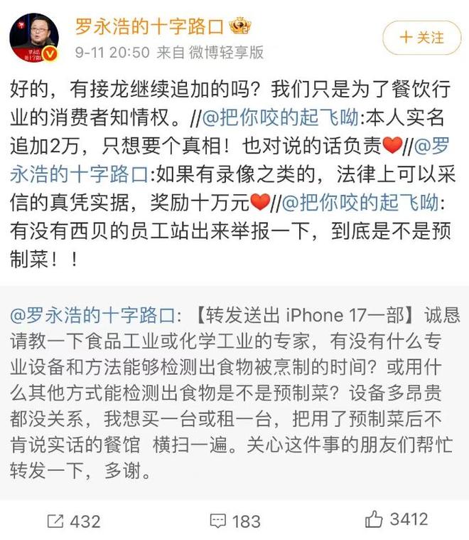 罗永浩也没闲着,连发 20 多条微博对线,又是转发送 iPhone ,又是悬赏十万,甚至还顺势开了一场直播,就来讨论这事。