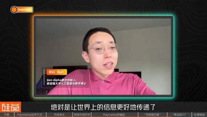 Bill Sun Gen Alpha联合创始人 斯坦福大学人工智能与数学博士: 我觉得这个info-fin(信息金融)绝对能让世界上的信息传递得更好,它给了我们一些非常可信的的Oracle(预言)。本质上你在ChatGPT上看不同的网页的时候,是不知道哪个网页比其他网页更值得信任的,也不知道大家对于一个未来事件的共识是怎么塑造的,你就只能看一些媒体,比如彭博社怎么说、那几个撰稿人怎么说。但是在Polymarket你可以看到买方共识,就是大家拿钱投出来的共识,这个东西是非常昂贵的,虽然可能跟真相不一样,大家用钱投出来的结果,其实是渐进地趋向于人类社会群体的共同真相。而且它实际上能够把以前很复杂的赌注变得非常干净,变成单因素投注。比如以前我们去赌某一个失业数据的结果,是要通过赌10年期国债收益率来表达,它有巨大的流动性。但另一方面,每一次10年期国债的波动,可能是由十个因素共同构成的,其中只有两个主要因素,但是我们去看Polymarket的时候,它是一个非常纯粹的单因素结果,所以就是Polymarket帮大家进行事件的因素分解法,我觉得是有非常高的价值。