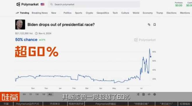 例如,在2024年美国总统大选的预热阶段,早在拜登总统正式宣布退选前几个月,主流媒体仍在将此事作为一种重要的可能性进行讨论时,Polymarket上“拜登是否会退选”的赌注,已经成为了一个反映内部情绪的“温度计”,其概率曾一度超过60%,这反映了公众舆论的实时判断。