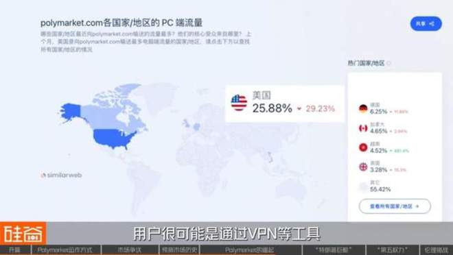 尽管有此禁令,根据网络分析平台Similarweb的数据,预估Polymarket网站的第一流量来源还是美国,占到了25.88%,用户很可能通过VPN等工具绕过了地理封锁。