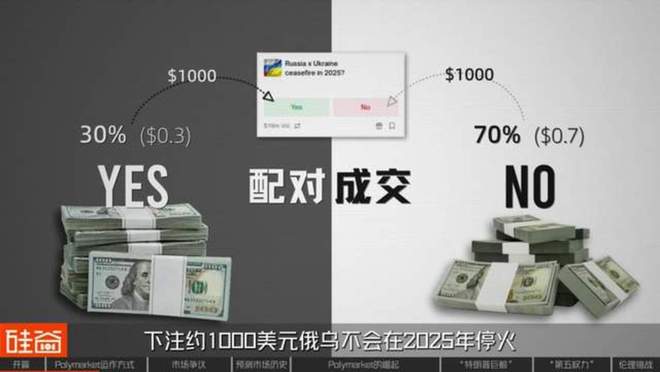 举个例子,你想以30%的概率(0.3美元)下注1000美元俄乌将在2025年停火,市场上必须正好有另一个人愿意以70%的概率(0.7美元),下注约1000美元俄乌不会在2025年停火,你们的交易才能撮合成功。