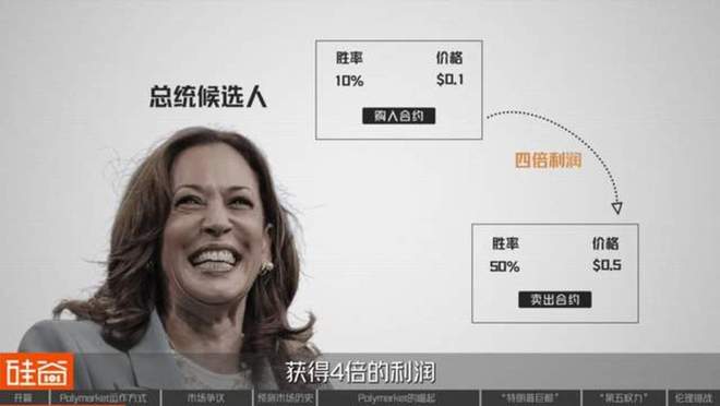 这意味着,你可以根据实时变化的概率,来锁定利润或割肉止损。假设你在哈里斯刚被提名为候选人、胜选概率仅为10%,也就是价格0.1美元时,买入了她的合约,当她的民调在几个月后飙升至50%时,价格涨到0.5美元,你可以立刻卖出,获得4倍的利润,而无需关心哈里斯最终是否真的赢得大选。