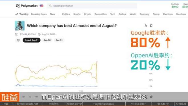 同样的故事也发生在科技行业。在今年一个“哪家公司会在8月底前拥有最佳AI模型”的赌注中,一开始Google领先,但随着OpenAI将要发布GPT-5的传闻出现,OpenAI的胜率一度超过了70%。
