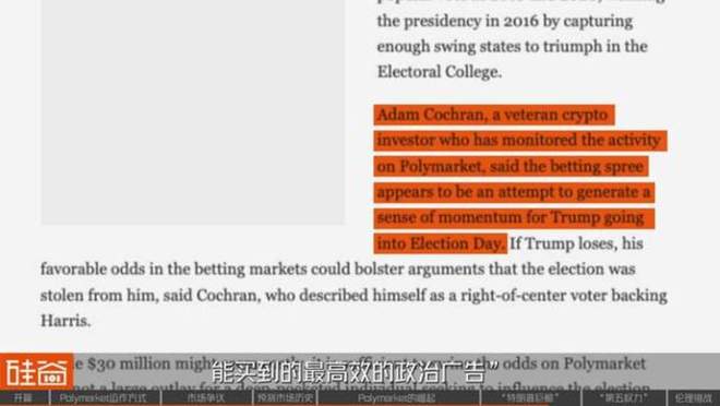 在华尔街日报的报道中,一位加密风险投资公司的合伙人Adam Cochran就评论道:“这(指在Polymarket下注)是迄今为止能买到的最高效的政治广告。”