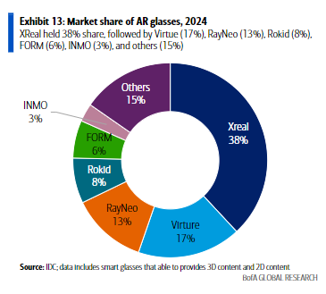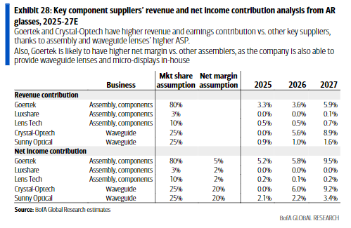 舜宇光学:作为摄像头模组和衍射波导的领先供应商,其来自智能眼镜的收入贡献预计到2027年将增长至4%,盈利贡献则达到6%。