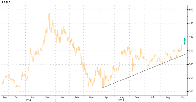 市场对此反应迅速且积极。文件披露后,特斯拉股价在周一盘前交易中一度飙升超过8%,触及428美元水平,推动公司市值猛增约1000亿美元。有分析指出,此轮上涨帮助该股在技术上实现了突破。