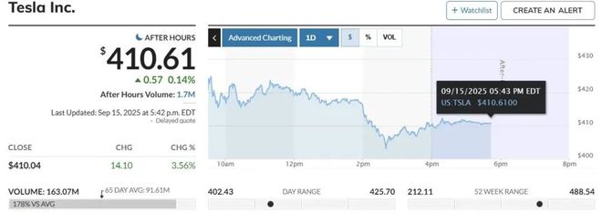 美股开盘后特斯拉继续走高,盘初刷新日高时,股价涨约7.5%,最终收涨近3.6%,报410.04美元,连涨五个交易日,刷新1月23日以来收盘高位。